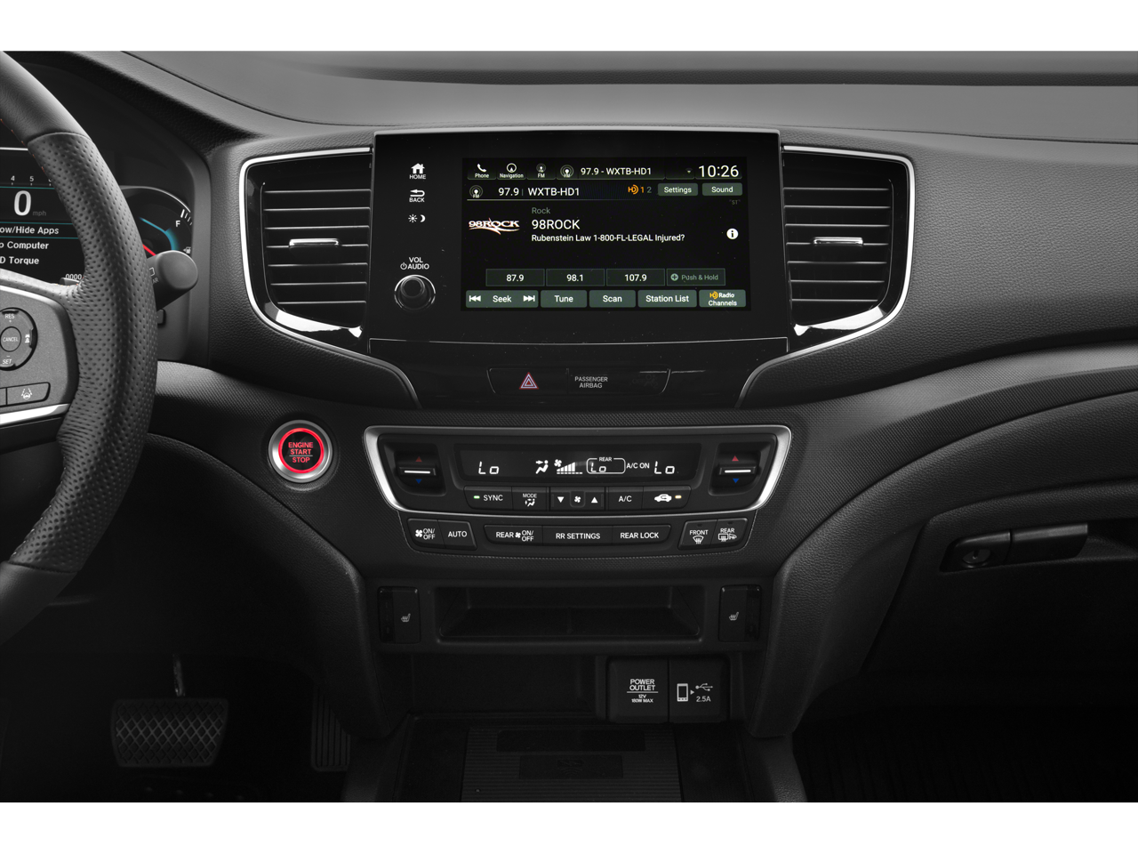 - Radio: 215-Watt Audio System -inc: 7 speakers, subwoofer, Bluetooth® HandsFreeLink and streaming audio, MP3/auxiliary input jack, Radio Data System (RDS), Speed-sensitive Volume Compensation (SVC), 2.5-amp USB charging port (1 port in center console/2 ports on 2nd-row), 8" display audio w/high-resolution touch-screen and customizable feature settings, HondaLink, CabinControl remote compatibility, Apple CarPlay integration, Android Auto integration, SMS text message function, SiriusXM (SiriusXM requires a subscription after any trial period, If you decide to continue your SiriusXM service at the end of your trial subscription, the plan you choose will automatically renew and bill at then-current rates until you call SiriusXM at 1-866-635-2349 to cancel, See our customer agreement for complete terms at www.siriusxm.com, Fees and programming subject to change, Available in the 48 contiguous United States and D.C, SiriusXM and all related marks and logos are trademarks of SiriusXM Radio Inc.), HD radio, 2.5-amp USB smartphone/audio interface (1 port in front console), wireless phone charger and Honda Satellite-Linked Navigation System w/voice recognition and Honda HD digital traffic